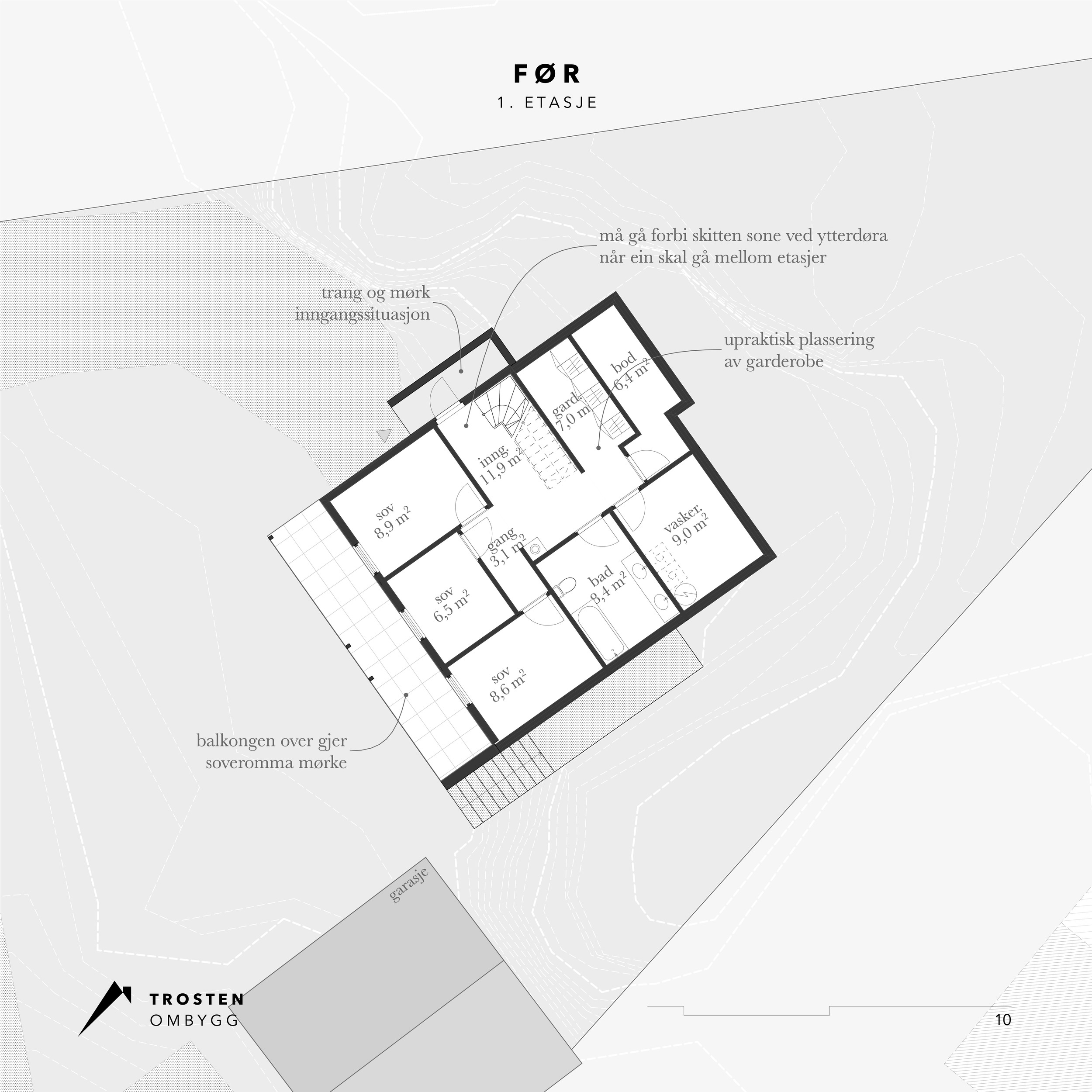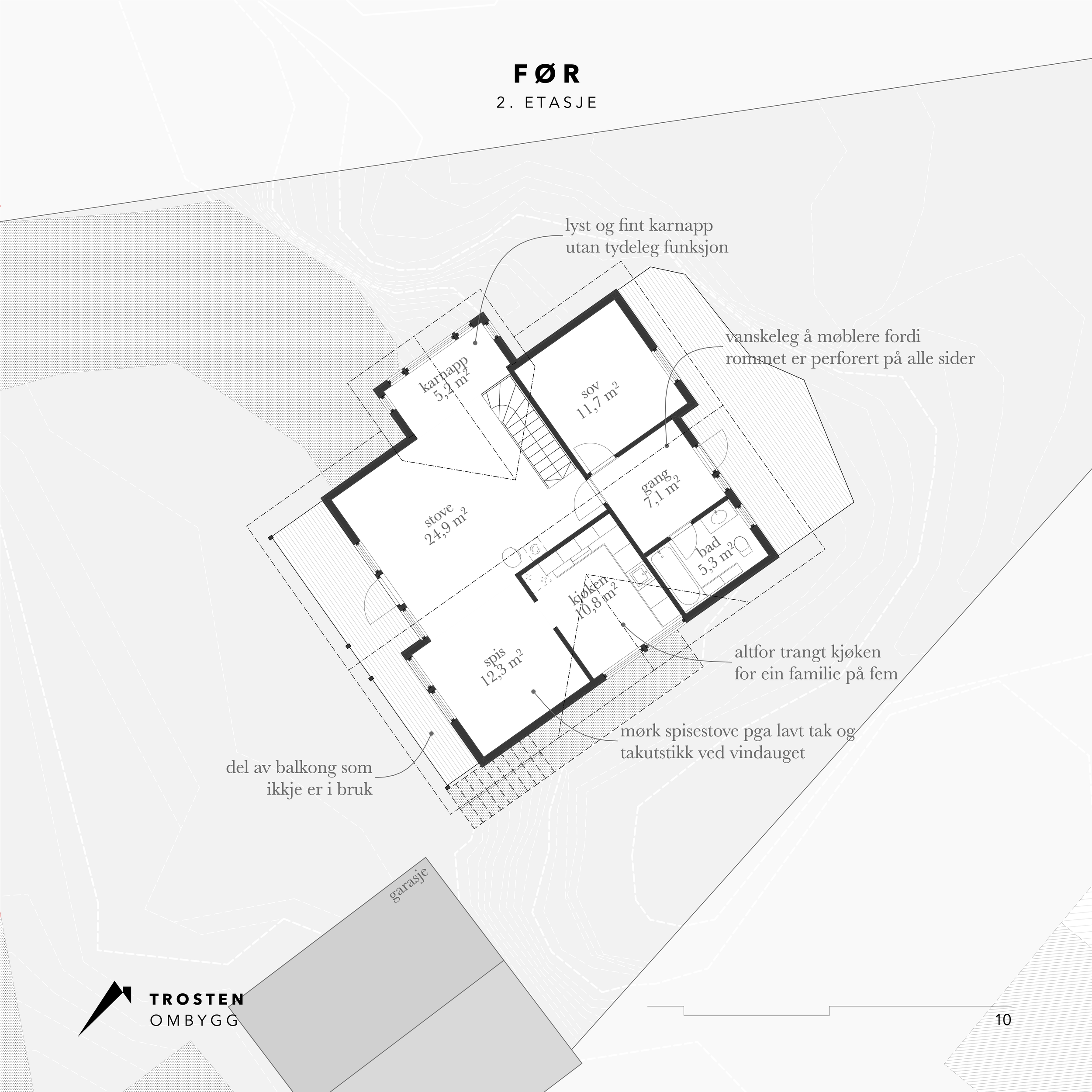 Kjøkenet var lyst og fint, men altfor lite for ein familie på fem. Spisestova låg i ein mørk del av planen, der taket skrår ned og vindauga slepper inn lite lys på grunn av takutstikk. Samtidig fanst det rom med stort potensial: eit lyst og vakkert karnapp og eit gangrom utan tydeleg funksjon.