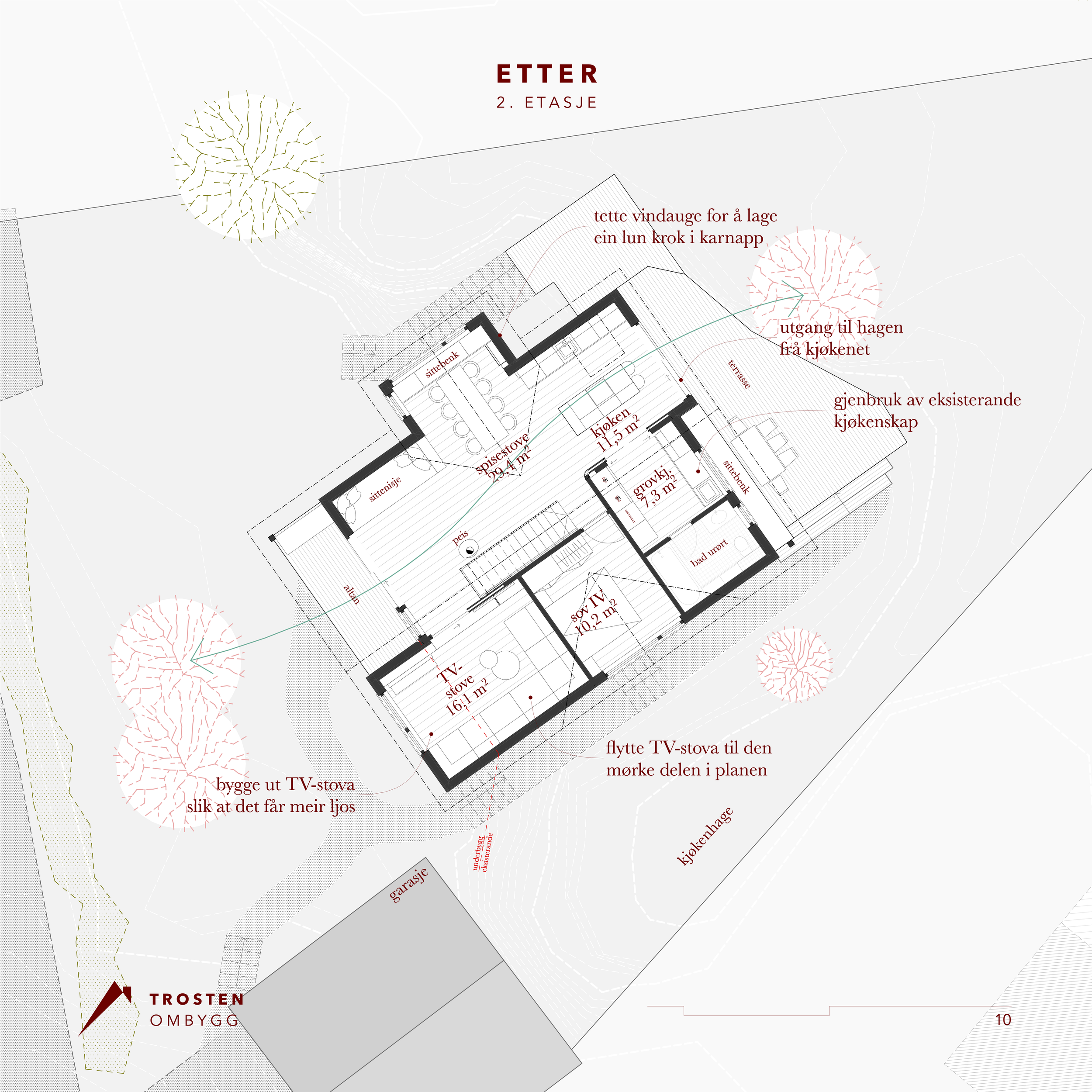 I hovudetasjen er kjøkenet flytta til det nordlege hjørnet, med direkte tilgang til hagen. Det tidlegare gangrommet er blitt eit grovkjøken, eigna til både brødbaking og tomatplanting, medan karnappet no rommar spisestova. Den mørke kroken i det sørlege hjørnet er gjort om til eit raust TV-rom med plass til piano. Det gamle kjøkenet har i staden blitt eit nytt og lyst soverom.