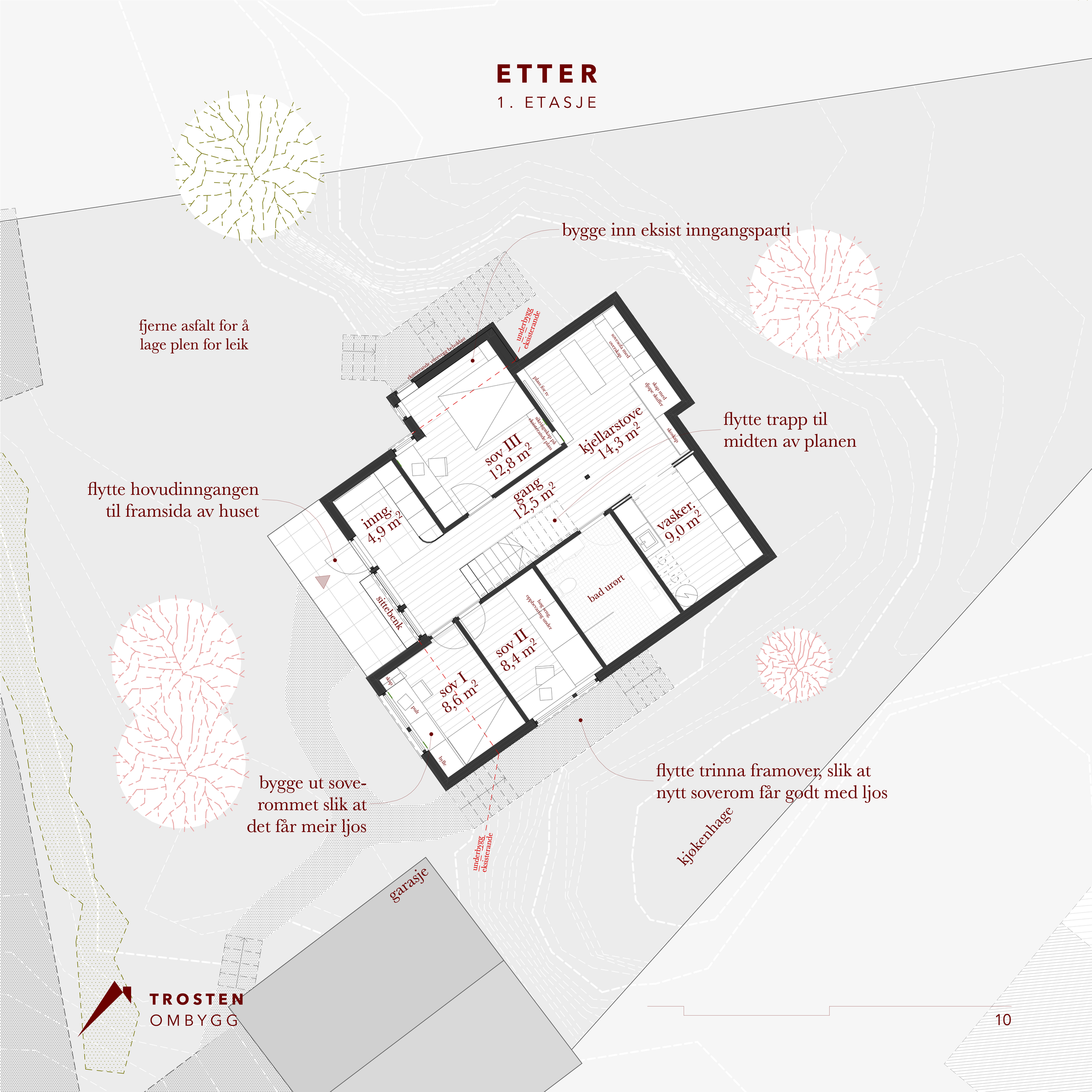 Førsteprioriteten var å flytte hovudinngangen til framsida av huset. Den eksisterande altanen vart bevart, slik at inngangspartiet framleis fekk ei naturleg overdekning. Store glasfelt slepper no rikeleg med dagslys inn, også djupt inn i planen. Trappa er flytta til midten av huset, noko som gir ei meir naturleg sirkulasjon. I sokkeletasjen er det framleis tre soverom, men bod og garderobe er no opna opp til ei kjellarstove.